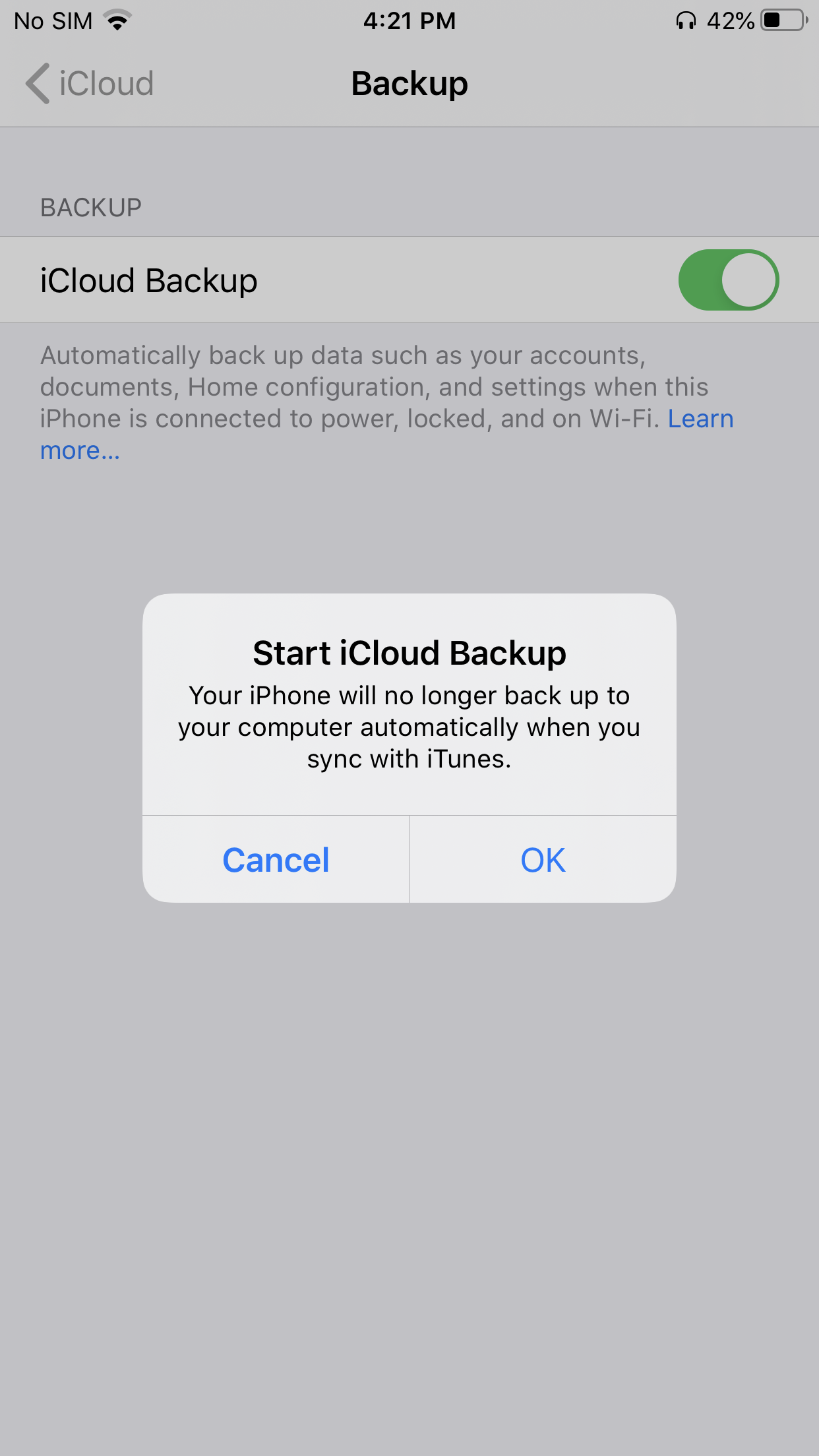To confirm enabling of iCloud backup tap, ‘OK’.