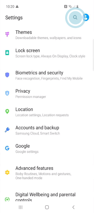 Return to the main settings screen, this can be done by dragging the notification bar down and pressing the ‘gear’ icon as done previously. Here near the top of the screen can be found a magnifying glass icon, tap it to open the search bar.