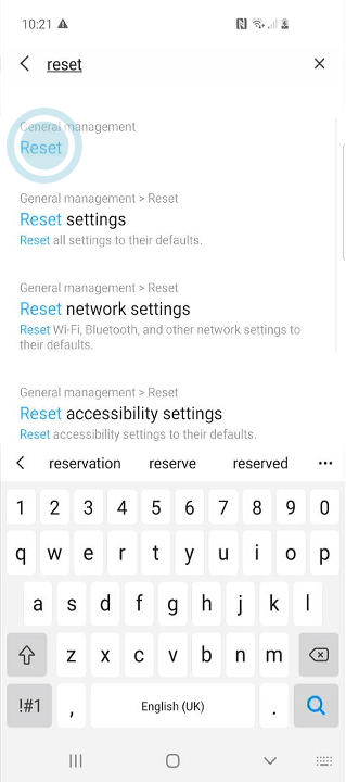 In the search bar type ‘reset’, tap the top result to open the ‘reset’ settings.